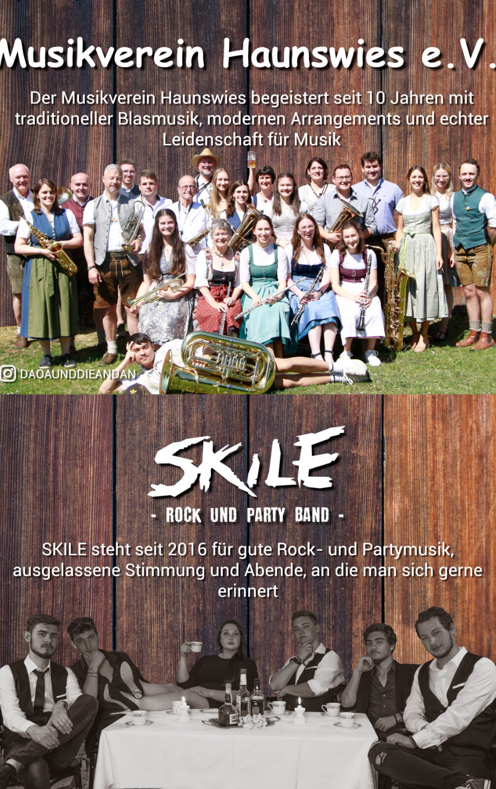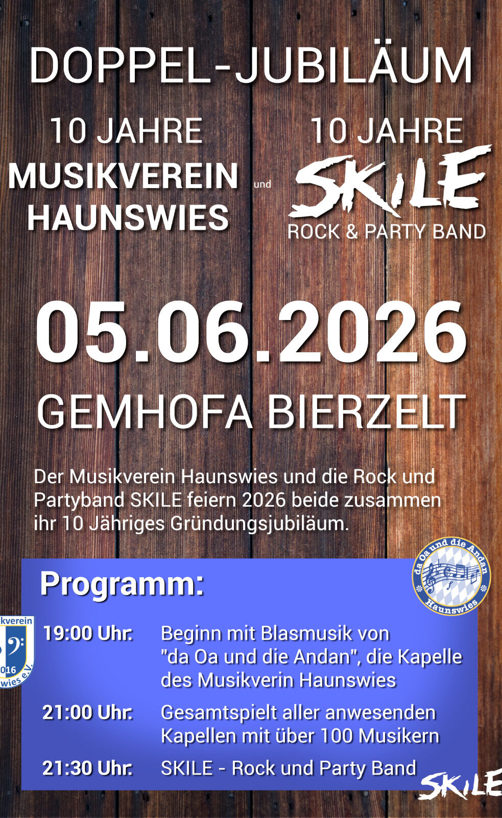 Wir feiern dieses Jahr stolze 10 Jahre Musikverein Haunswies 🎉 Gemeinsam mit der Rock- und Party-Band „Skile“, die ebenfalls ihr 10-jähriges Bestehen feiern, laden wir euch alle ein: Am 5.6.2026 im Gemhofa Bierzelt, der Eintritt ist frei. Gemeinsam mit verschiedenen Blasorchestern wollen wir musizieren und danach ordentlich mit euch feiern. Also: Kommt’s vorbei, mia frein uns 😉